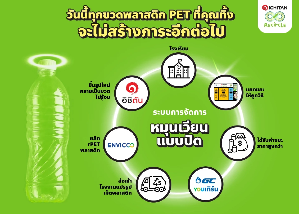 คุณเคยสงสัยไหมว่า ขวดน้ำดื่ม PET ที่คุณดื่มหมดแล้วจะไปไหนต่อ? จากข้อมูลพบว่า 86% ถูกทิ้งไว้ที่หลุมฝังกลบ มีแค่ 14% ได้รับการนำกลับไปรีไซเคิล แต่วันนี้ขวดพลาสติก PET ที่คุณทิ้ง จะไม่สร้างภาระ สร้างมลภาวะอีกต่อไป อิชิตัน กรุ๊ป เปิดตัว "Ichitan ReCircle" วนเวียนเปลี่ยนให้โลกสะอาด โครงการเก็บ-กลับระบบรีไซเคิลหมุนเวียนแบบปิด (Closed-Loop Circular)
