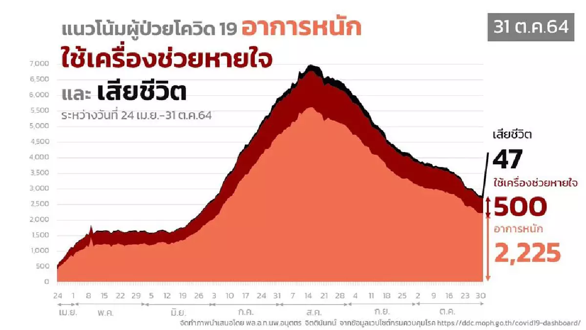 ถึงแม้ตอนนี้สถานการณ์ของระบบรักษาพยาบาลผู้ป่วยโควิด 19 ส่วนใหญ่จะคลี่คลายลง โดยเฉพาะในกรุงเทพและปริมณฑล แต่ก็ไม่ใช่ว่าบุคลากรทางการแพทย์ในพื้นที่ที่การระบาดลดลงจะสบายขึ้นมากนะครับ เรามีผู้ป่วยโรคทั่วไปที่ไม่ใช่โควิด 19 กลับมารับการรักษาเพิ่มขึ้นหลังจากอัดอั้นอยู่ในช่วงการระบาดหนัก ผู้ป่วยผ่าตัด ทำหัดถการ วินิจฉัยและรักษาโรคเริ่มกลับมา คงต้องระวังไม่ให้มีการระบาดหนักขึ้นอีก เพราะเราอาจไม่สามารถปรับการรักษาพยาบาลให้กลับมาเหมือนตอนที่เคยมีผู้ป่วยโควิด 19 ใน รพ. รวมผู้ป่วยอาการหนักและใช้เครื่องช่วยหายใจที่เคยสูงสุดกว่า 2 เท่าของภาระในปัจจุบันได้อีก