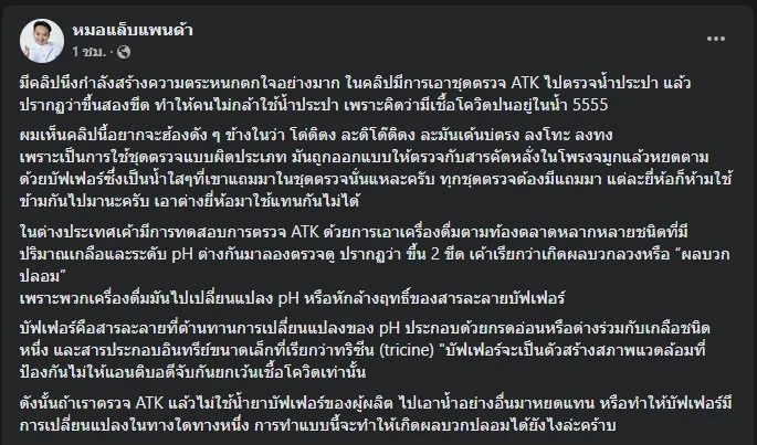 อย่าตื่นตระหนก! หมอแล็บแพนด้า ชี้แจง กรณีมีผู้ใช้งานนำ ATK ไปตรวจโดยใช้น้ำประปาแล้วผลขึ้น 2 ขีด เป็นเพราะผลลวง ไม่ได้มีเชื้อโควิด ที่สำคัญผลลวงเพราะว่าการใช้งานผิดประเภทเลยเจอผลบวกปลอม